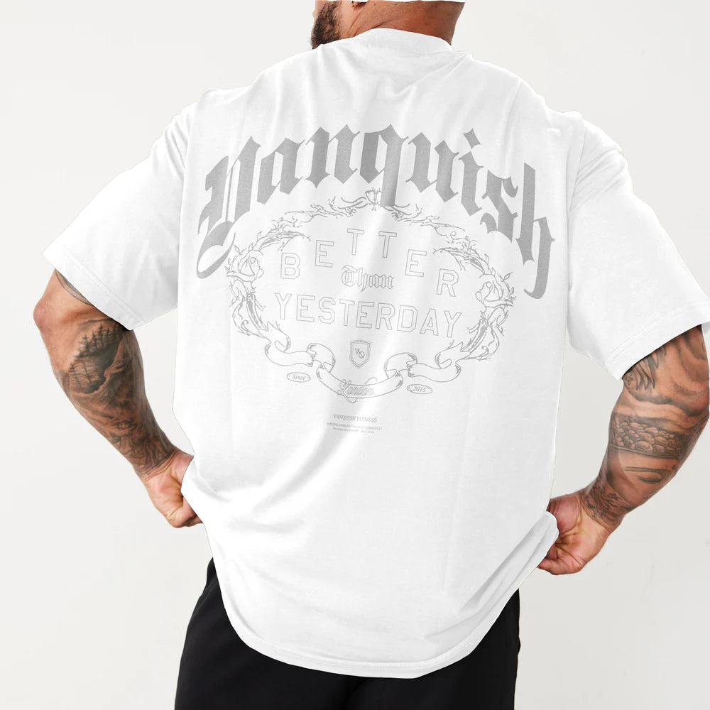 Dejando atrás el éxito de nuestro modelo Dark Script, presentamos la Vanquish Revolve Wreath Black Oversized T Shirt, diseñada para capturar la esencia del verano con el motivo "Mejor que ayer". Su corte oversize, ligeramente más largo, ofrece comodidad y estilo relajado. Confeccionada en algodón ligero y suave, es ideal para entrenar y mantener frescura durante los días cálidos. Esta camiseta combina funcionalidad y estética para quienes buscan rendimiento sin sacrificar diseño.